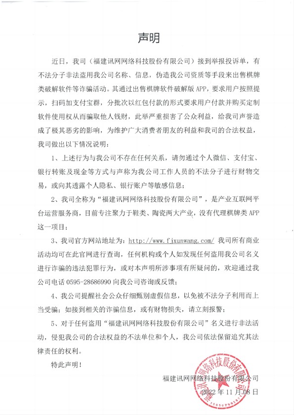 近日,我司(福建訊網(wǎng)網(wǎng)絡(luò)科技股份有限公司)接到舉報(bào)投訴單,有不法分子非法盜用我公司名稱(chēng)、信息,偽造我公司資質(zhì)等手段來(lái)出售棋牌類(lèi)破解軟件等詐騙活動(dòng)。其通過(guò)出售棋牌軟件破解版APP,要求用戶按照提示,掃碼加支付寶群,分批次以紅包付款的形式要求用戶付款并購(gòu)買(mǎi)定制軟件使用權(quán)從而騙取他人錢(qián)財(cái),此舉嚴(yán)重?fù)p害了公眾利益,給我司聲譽(yù)造成了極其惡劣的影響,為維護(hù)廣大消費(fèi)者朋友的利益和我司的合法權(quán)益,我司做出以下情況說(shuō)明: