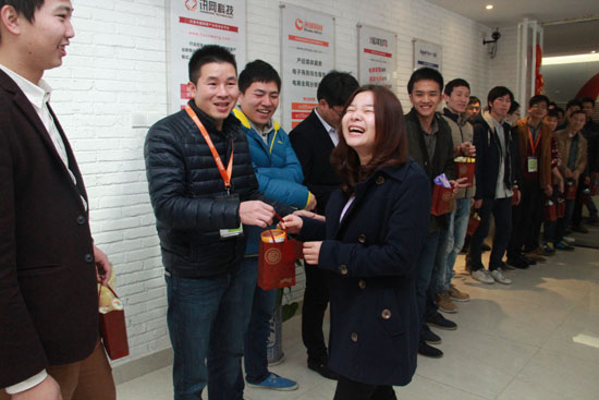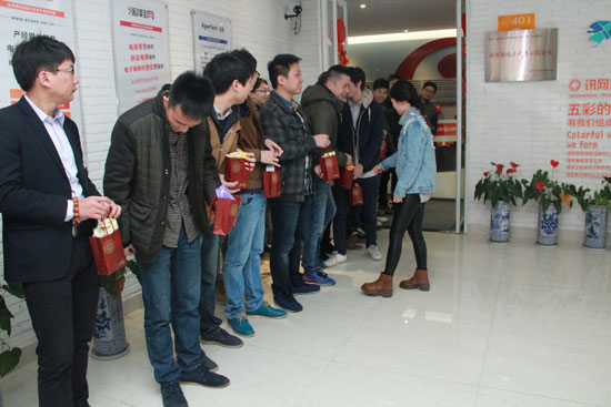 名義上是要給訊網(wǎng)科技的妹子們過“三八婦女節(jié)”,不過大家更愿意提前一天過“三七妹子節(jié)”(當(dāng)然是妹子比婦女聽起來更年輕一些~~~)。為了讓廣大妹子們過個(gè)舒心的節(jié)日,親愛的行政主管美玲姐姐可是操碎了心,上周五下午下班前就神秘兮兮地通知大家,今早上貼心禮物。果然,周六早上剛跨進(jìn)辦公室,一份份誘人的早餐已經(jīng)擺上桌了,豆奶、小蛋糕還不夠,連球球最愛的果凍都有~~~