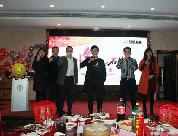 王董攜訊網(wǎng)全體股東上臺(tái)向全體員工敬酒。