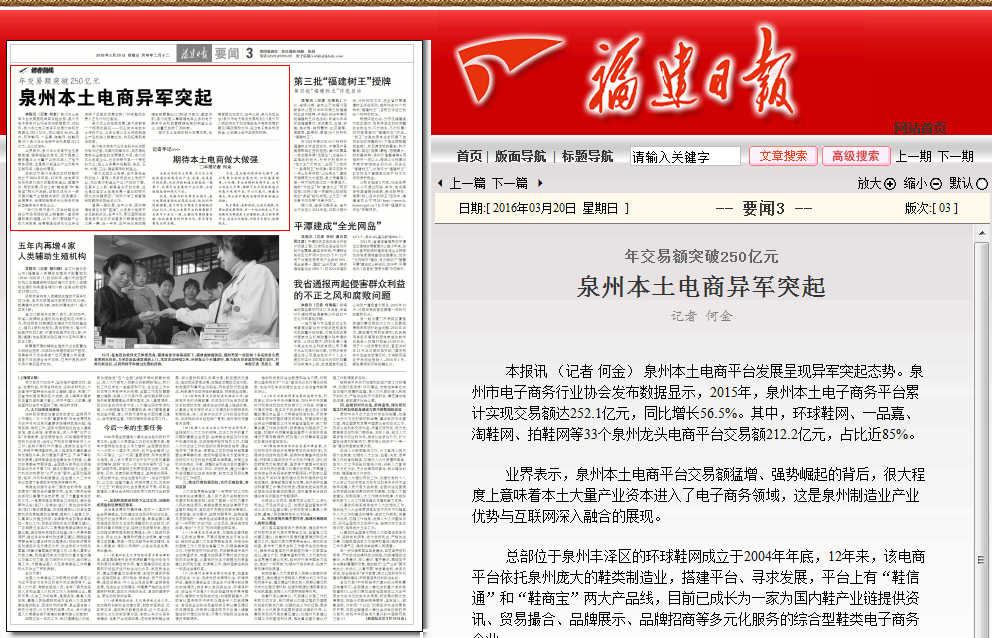 總部位于泉州豐澤區(qū)的環(huán)球鞋網(wǎng)成立于2004年年底,12年來,該電商平臺依托泉州龐大的鞋類制造業(yè),搭建平臺、尋求發(fā)展,平臺上有“鞋信通”和“鞋商寶”兩大產(chǎn)品線,目前已成長為一家為國內(nèi)鞋產(chǎn)業(yè)鏈提供資訊、貿(mào)易撮合、品牌展示、品牌招商等多元化服務(wù)的綜合型鞋類電子商務(wù)企業(yè)。