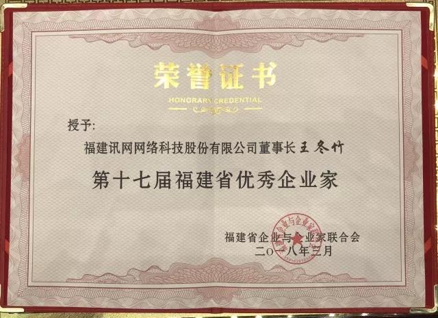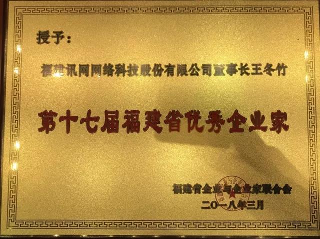 5月19日,第十七屆福建省優(yōu)秀企業(yè)家表彰大會在福州召開,福建省副省長鄭新聰?shù)阮I導出席,共有122名優(yōu)秀企業(yè)家獲此殊榮,訊網網絡董事長王冬竹榜上有名。