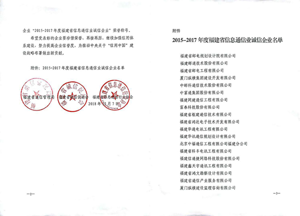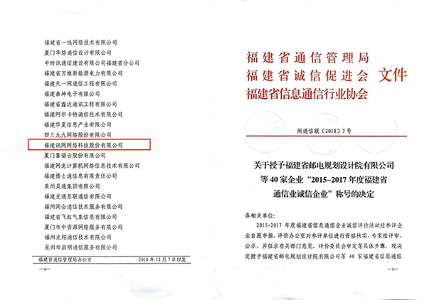 訊網(wǎng)榮獲“2015-2017年福建省信息通信業(yè)誠(chéng)信企業(yè)”