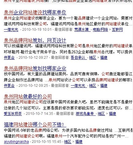 在百度搜索中,我們通過(guò)輸入“泉州品牌/企業(yè)網(wǎng)站建設(shè)”,可以直觀的看到顯示的以下信息: