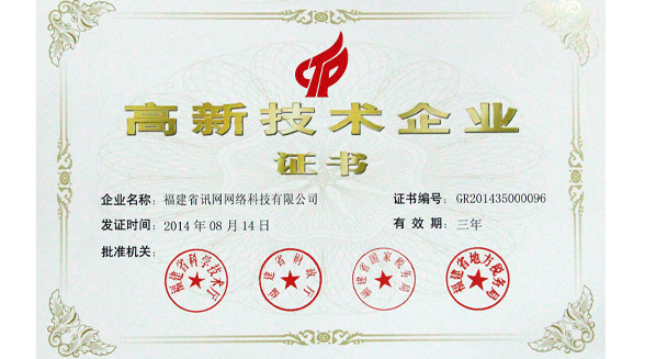 近日,福建省科技廳公布了2014年第一批高新技術企業(yè)名單,福建省訊網(wǎng)網(wǎng)絡科技有限公司成功獲批,成為國家高新技術企業(yè)。這標志著公司的技術研發(fā)、自主創(chuàng)新能力上了一個新臺階。